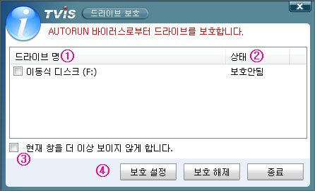 TVIS의 오토런 방지 기능은 기본적으로 이동식디스크(USB)를 연결하면 “오토런 방지” 설정 창이 출력 되도록 설정되어있습니다.