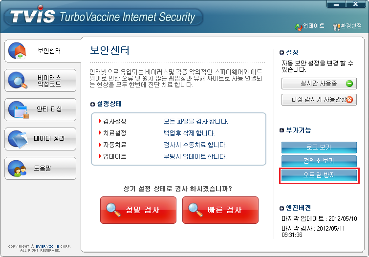 TVIS의 [보안센터] 에서 오른쪽 중간 즈음에 “부가기능” 영역 중 [오토 런 방지] 버튼을 클릭하면 오토런 방지 창을 출력 하실 수 있습니다.