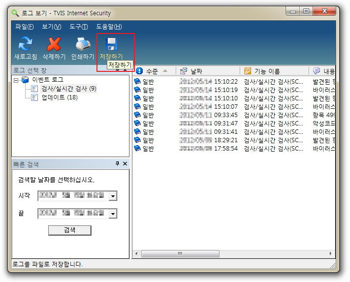 메뉴에서 [도구] ? [저장하기] 를 선택하거나 도구 모음에서 [저장하기] 버튼을 클릭하면, 현재 선택된 로그에 대한 내용을 텍스트 형식의 파일로 저장할 수 있습니다.