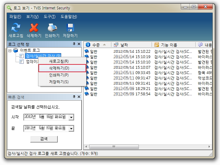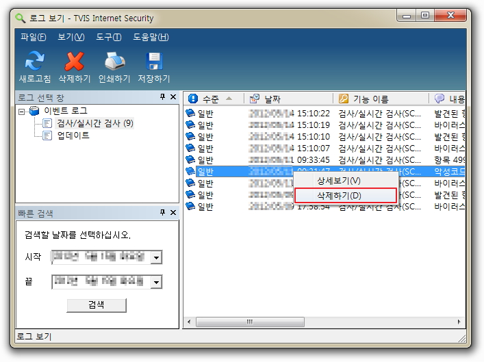 메뉴에서 [도구] [삭제하기] 를 선택 혹은 정보 창에서 우 클릭하여 [삭제하기]를 선택하시거나 도구 모음에서 [삭제하기] 버튼을 클릭하시면 선택된 로그 기록이 삭제됩니다.