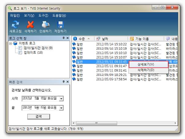 로그에 대한 세부 내용을 자세히 보고 싶은 경우 정보 창에서 우 클릭하여 상세보기를 선택하시면 세부 내용을 볼 수 있습니다.