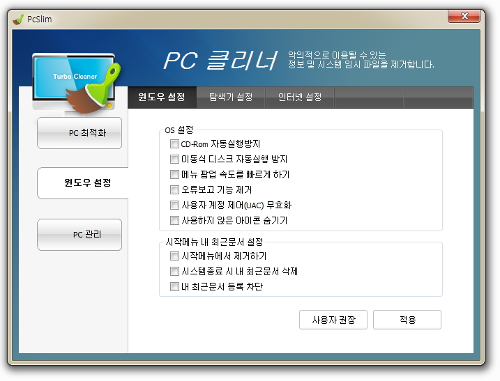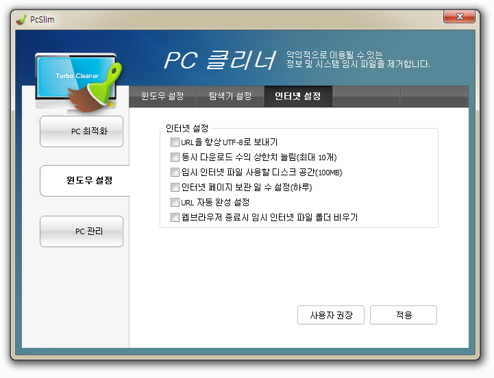 (참고) [사용자 권장] 버튼은 TurboVaccine Internet Security가 권장하는 설정을 지정해줍니다.