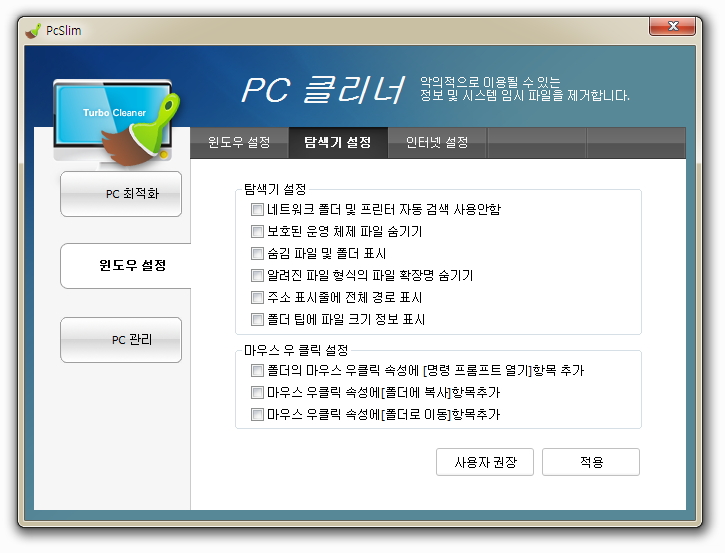 (참고) [사용자 권장]버튼은 TurboVaccine Internet Security가 권장하는 설정을 지정해줍니다.