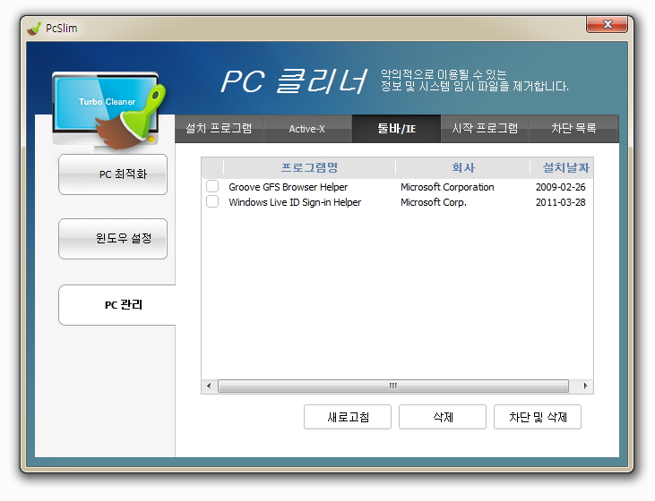 차단된 Active-X , 툴바/IE 및 시작 프로그램 목록을 보여줍니다.
