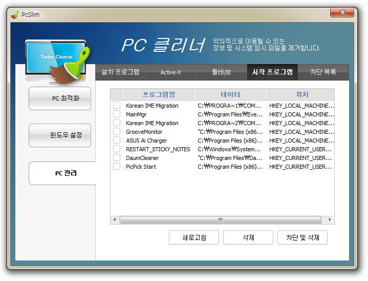 PC의 부팅 시 자동으로 시작되는 프로그램의 목록을 보여줍니다.