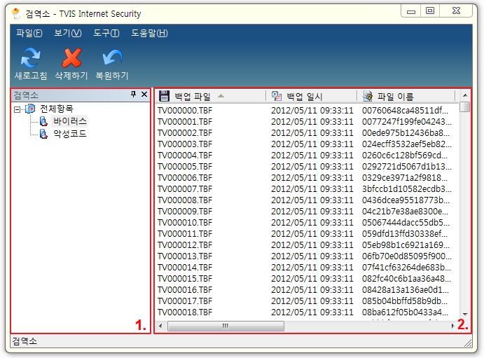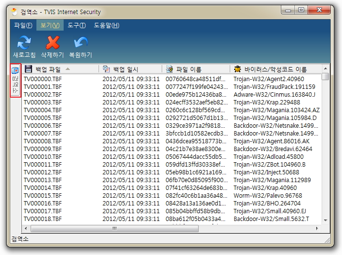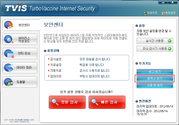 TurboVaccine Internet Security는 불필요 데이터 정리, 바이러스 치료, 스파이웨어 치료 등을 통해 혹여 있을지 모르는 중요 파일 손실을 막기 위해 검역소를 만들어 삭제된 파일을 백업하여 두었다가 필요 시 복구할 수 있습니다.