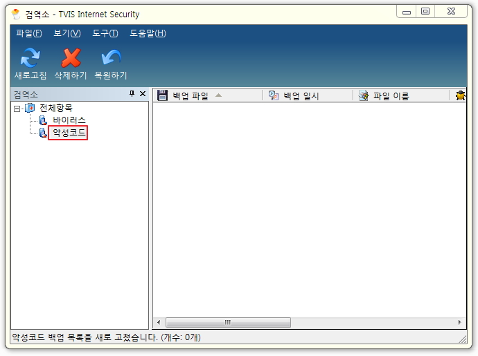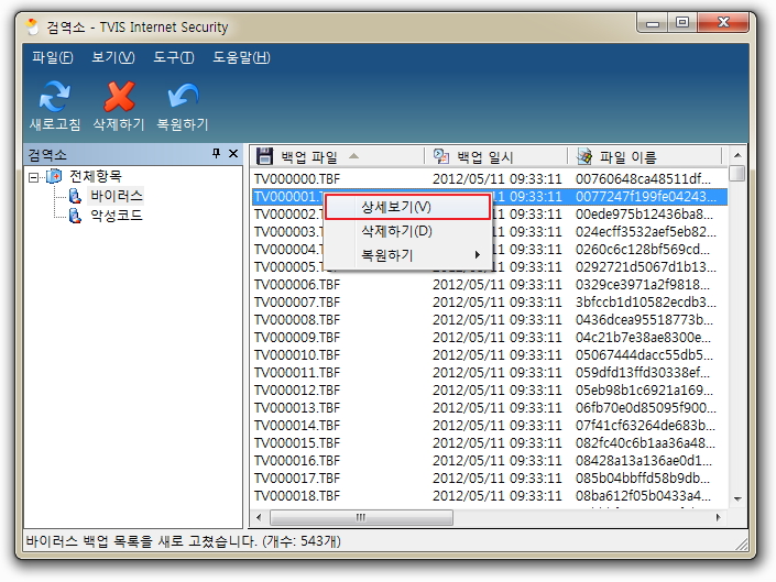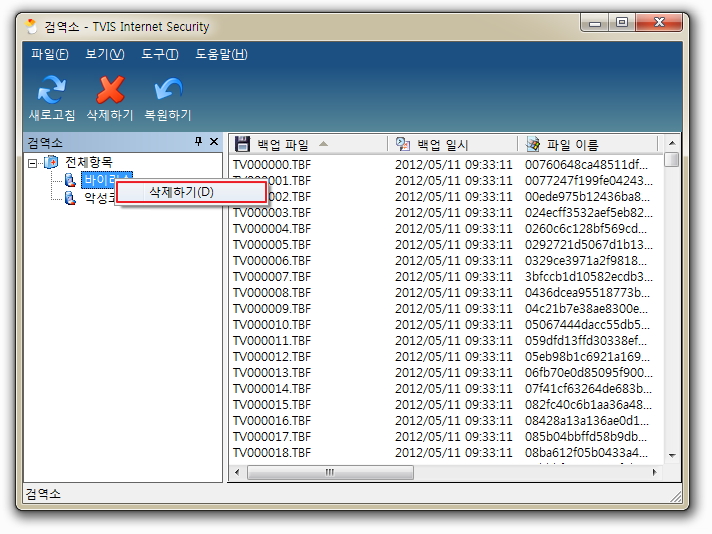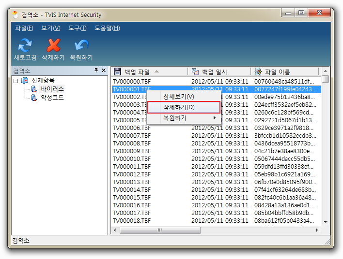 (참고) 여러 개의 백업 파일을 삭제하실 경우는 [Shift]를 누른 상태에서 여러 개를 선택하신 후, [삭제하기]를 클릭하시면 됩니다. 또한 정보 창에 있는 백업 파일을 한꺼번에 삭제하고 싶으신 경우에는 검역소 선택 창에서 삭제하실 백업 파일을 선택하신 후, 마우스 우 클릭하여 [삭제하기]를 선택하시면 현재 선택된 백업 파일을 한꺼번에 모두 삭제하실 수 있습니다.