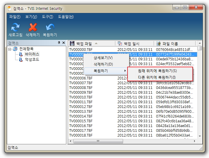 (참고) 여러 개의 백업 파일을 복원하실 경우는 [Shift]를 누른 상태에서 여러 개를 선택하신 후, [복원하기]를 클릭하시면 됩니다. 또한 정보 창에 있는 백업 파일을 한꺼번에 복원하고 싶으신 경우에는 검역소 선택 창에서 복원하실 백업 파일을 선택하신 후, 마우스 우 클릭하여 [복원하기]를 선택하시면 현재 선택된 백업 파일을 한꺼번에 모두 복원하실 수 있습니다.