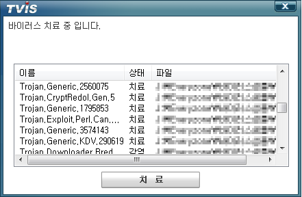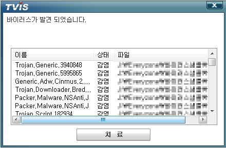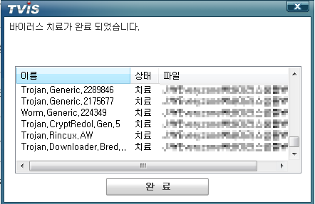 치료가 완료되면 위에 “바이러스 치료가 완료 되었습니다” 라는 메시지가 나옵니다.
