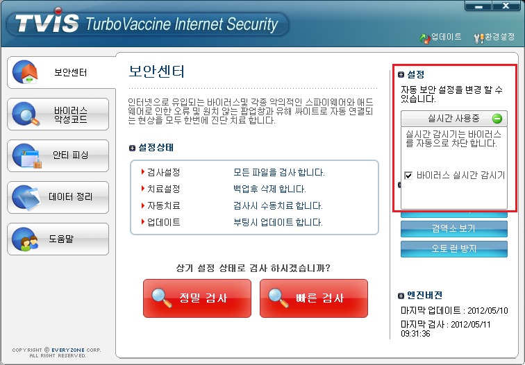 “바이러스 실시간 감시기”를 체크하시면 실시간 감시기가 작동됩니다.
