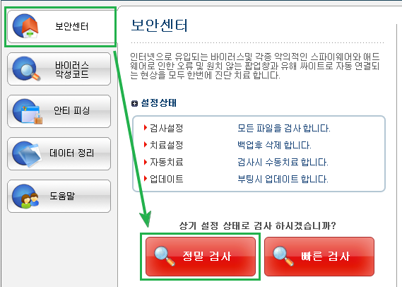 바이러스 및 악성코드를 PC내의 모든 영역에서 정밀하게 검사합니다. 검사 시간이 많이 소요 될 수 있습니다.