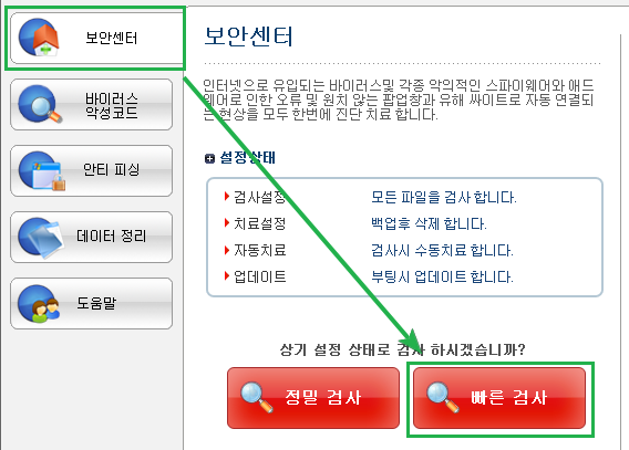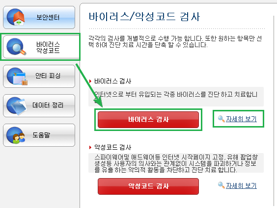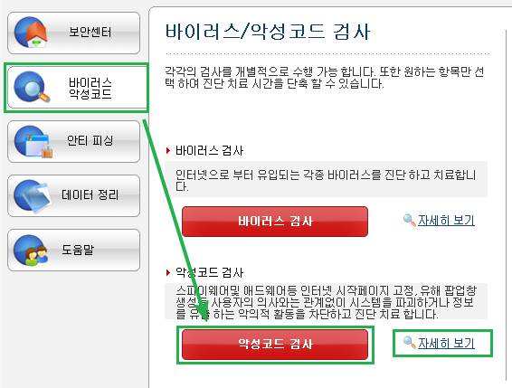 - 바이러스 악성코드 -> “악성코드 검사” 버튼