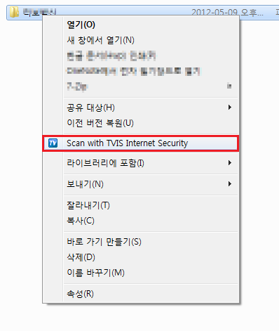 검사하고자 하는 폴더/파일에 마우스 우 클릭 하여 해당 파일을 검사합니다.