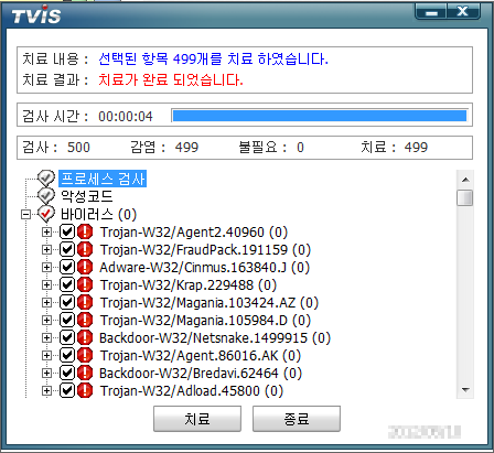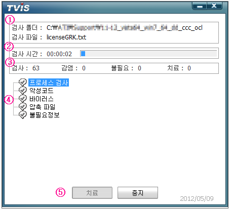 검사한 파일 수와 감염된 파일 수, 불필요한 정보 수, 치료 수를 보여줍니다.