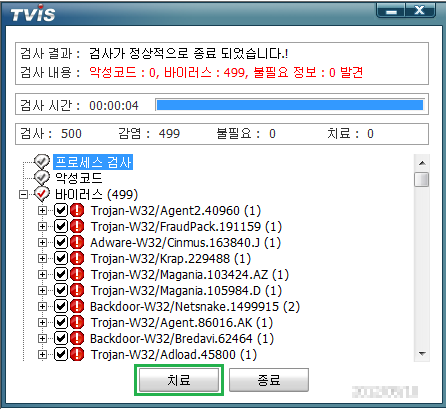 검사가 모두 끝나면 아래 [치료] 버튼이 활성화 됩니다.