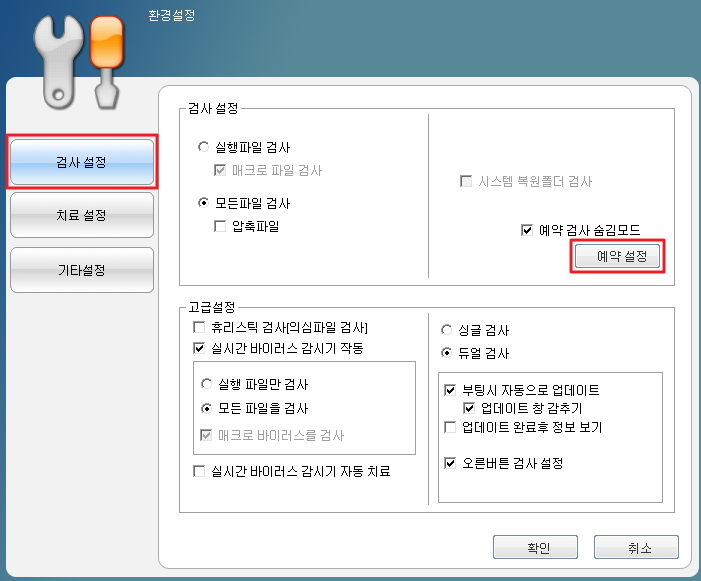- 환경설정 “검사설정” 메뉴에서 [예약 설정] 버튼을 클릭합니다.