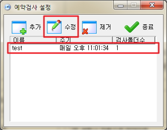 - 예약 검사 설정 화면에서 수정하고 싶은 검사를 클릭 후 [수정] 버튼을 클릭합니다.