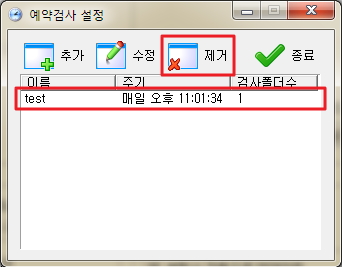 - “예약검사 설정” 창에서 제거하고자 하는 검사를 선택 하신 후 [제거] 버튼을 클릭해주세요