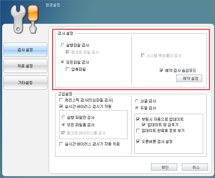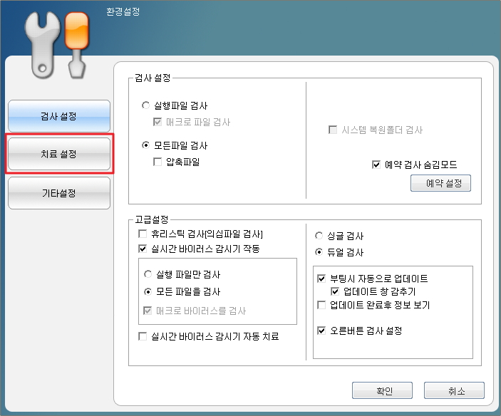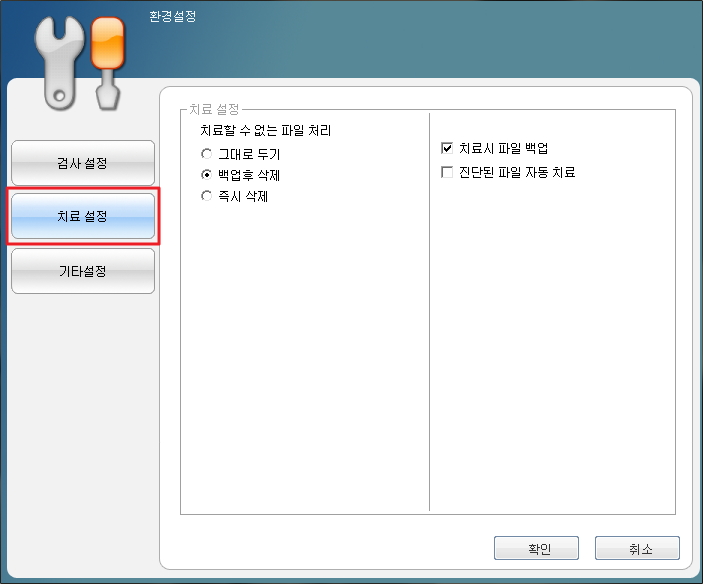 - 치료 시 파일 백업 : 치료 후 백업 여부를 선택합니다.