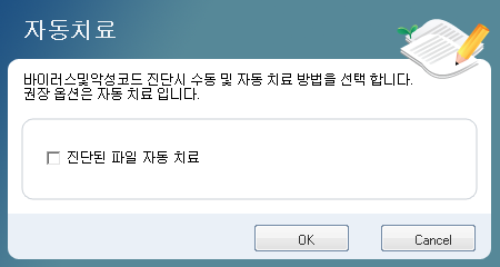 진단된 파일 자동 치료 : 바이러스 검사 후 치료버튼을 누르지 않아도 자동으로 치료됩니다.