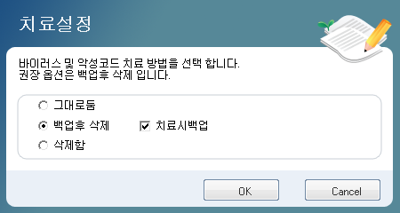 백업 후 삭제 : 바이러스를 치료 후 백업 후 삭제합니다. (권장설정)