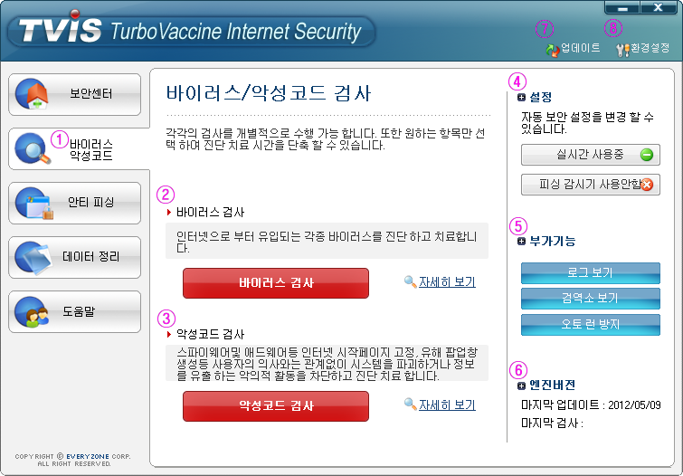 TurboVaccine Internet Security 의 주요 기능을 실행할 수 있는 메뉴 영역입니다.