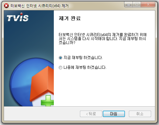 재 부팅을 원하시는 경우 [지금 재 부팅 하겠습니다.] 를 선택하시고, 재 부팅을 원하지 않은 경우 [나중에 재 부팅하겠습니다.]를 선택 후 [마침] 버튼을 클릭해주세요.